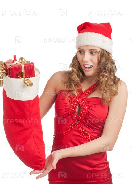 Молодая девушка в колпаке Санта-Клауса с полным носком рождественских подарков