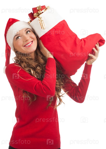 Молодая девушка в колпаке Санта-Клауса с полным носком рождественских подарков