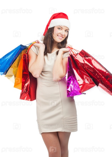 Молодая девушка в колпаке Санта-Клауса с цветными пакетами покупок