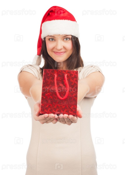 Молодая девушка в колпаке Санта-Клауса с красным ярким пакетом