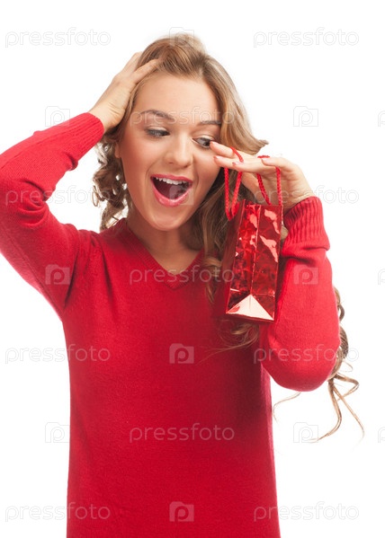 Молодая удивленная девушка в колпаке Санта-Клауса с красным ярким пакетом