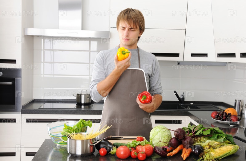 Мужчина готовит вегетарианскую пищу на кухне