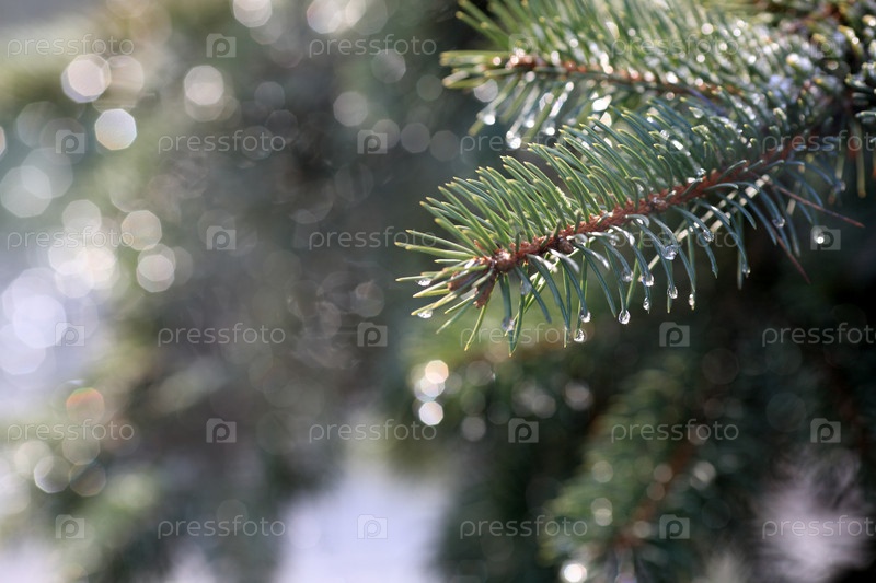 Весенняя роса на сосновой ветке на размытом фоне
