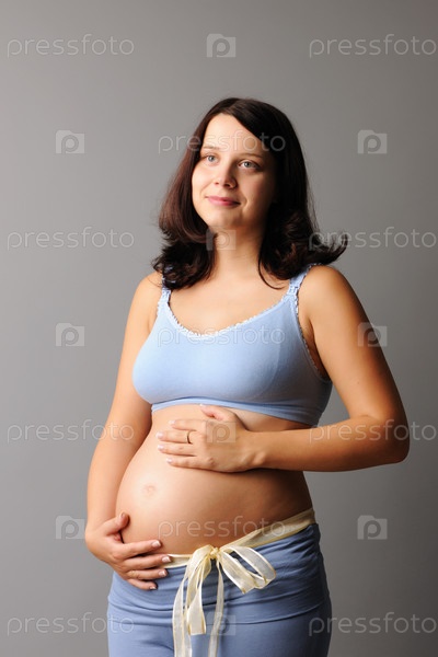 Портрет беременной женщины на сером фоне
