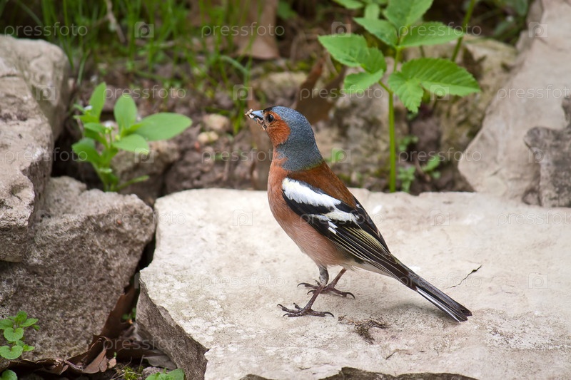 Зяблик на фоне травы и камней
