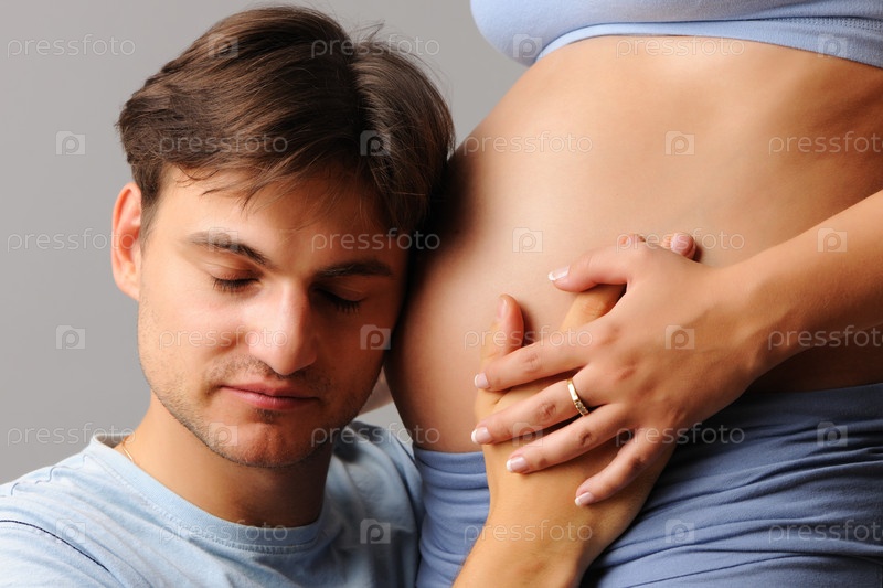 Муж обнимает живот беременной жены на сером фоне