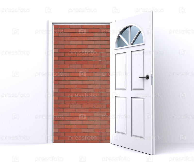 Кирпичная стена за открытой белой дверю