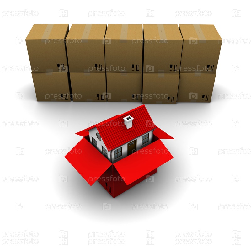 Дом, упакованный в коробку, и еще несколько картонных коробок на белом фоне