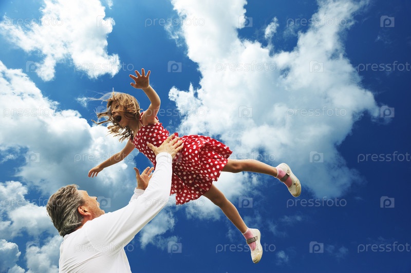 Мужчина подбрасывает счастливую маленькую девочку в воздух