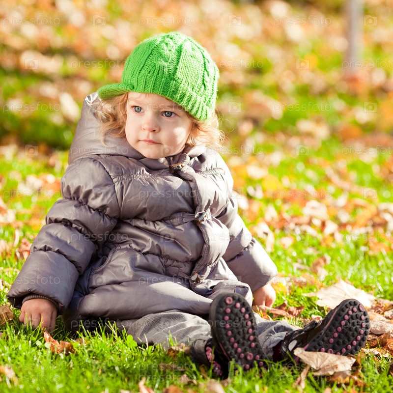 Маленькая девочка сидит на траве в осеннем парке