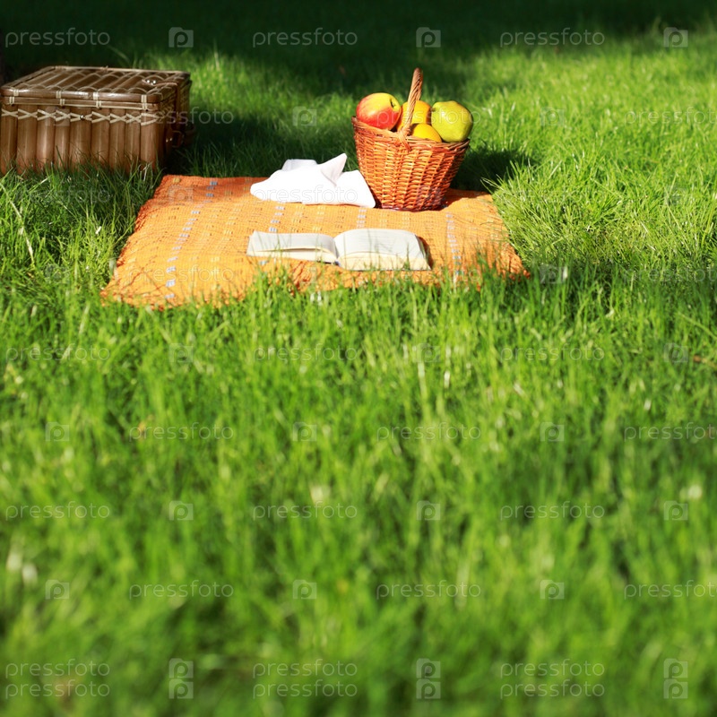 Корзина с фруктами и книга на одеяле. Пикник в летнем парке