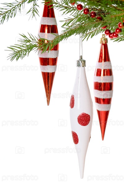 Еловые ветки, украшенные новогодними игрушками, на белом фоне