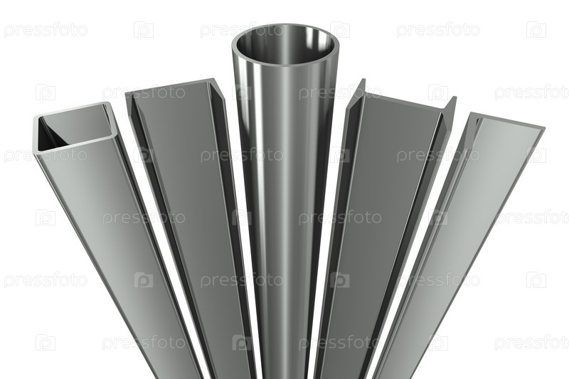 Металлическая труба, балка, уголок, шпунт и квадратная труба на белом фоне