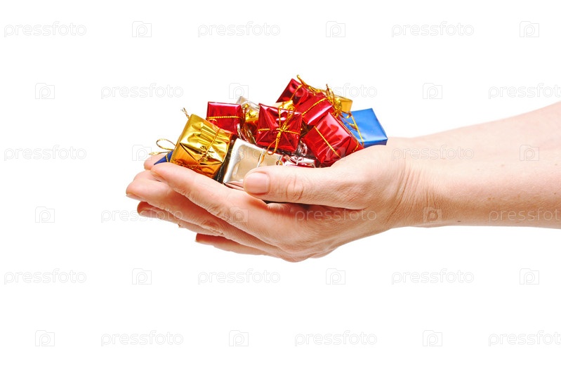 Маленькие подарочные коробочки в женских руках на белом фоне