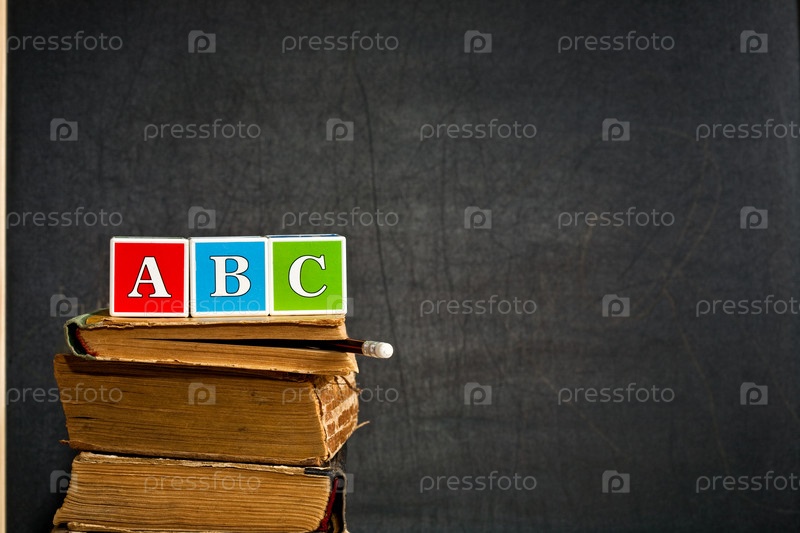 Кубики с буквами и старые учебники на фоне школьной доски, шаблон