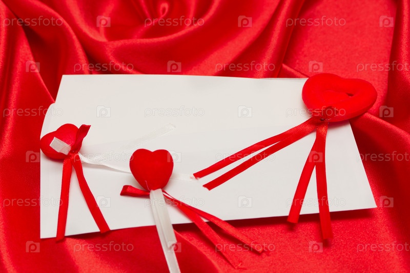 Белая карточка с сердечками на красном шелке