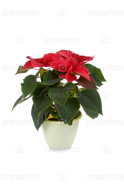 Красные цветы пуансеттия или рождественская звезда в горшке на белом фоне
