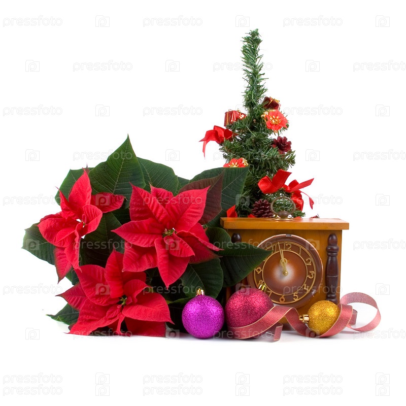 Красные цветы рождественская звезда, часы и елочные украшения на белом фоне
