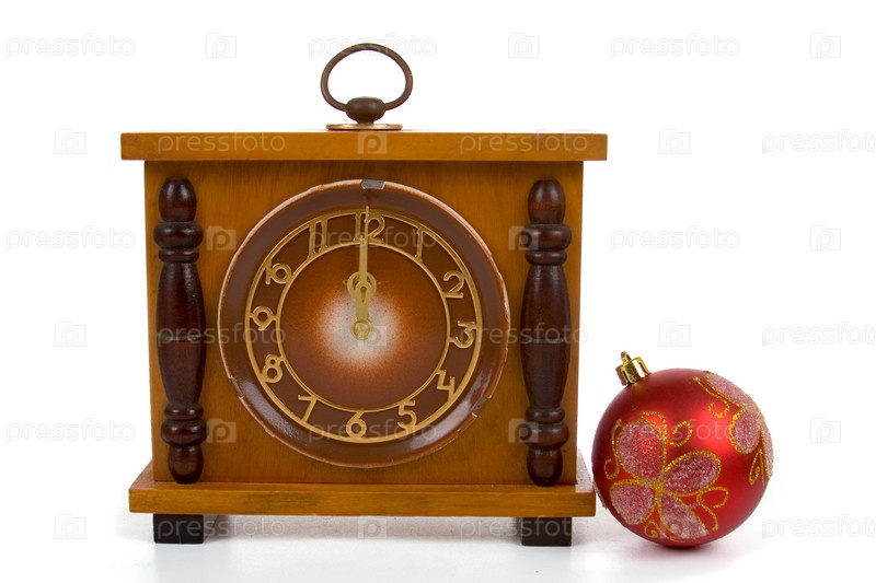 Старинные часы и елочный шар на белом фоне