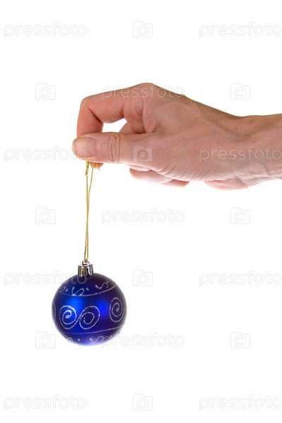 Золотой елочный шар в мужской руке на белом фоне