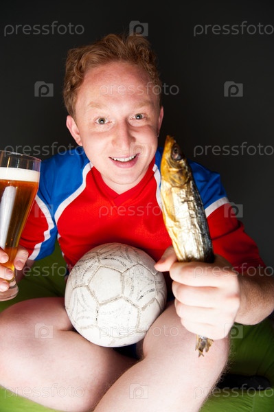 Футбольный болельщик с бокалом пива и рыбой, сидящий перед телевизором