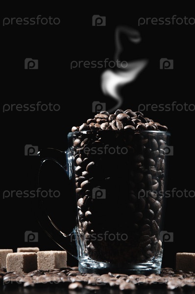 Кружка с обжаренными кофейными зернами, на черном фоне