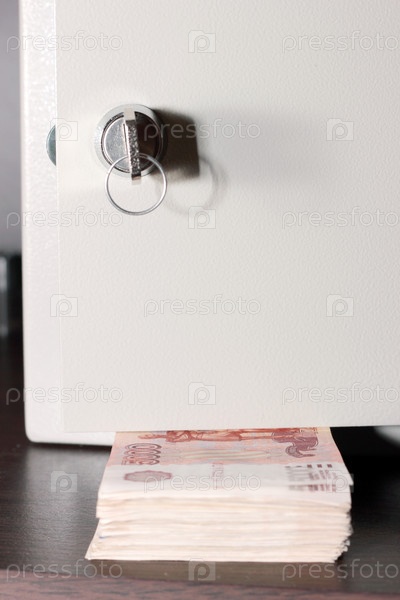 Стопка пятитысячных купюр около сейфа
