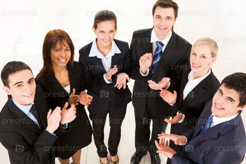Выше снимок счастливых деловых партнеров, аплодирующих и смотрящих на камеру