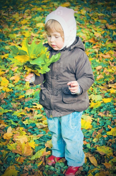 Маленькая девочка на прогулке в осеннем парке с букетом осенних листьев