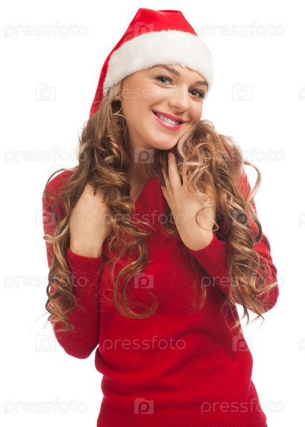 Молодая девушка в колпаке Санта-Клауса на белом фоне