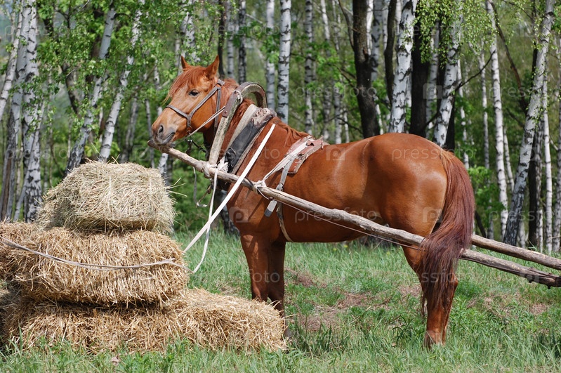 Запряженная лошадь ест сено