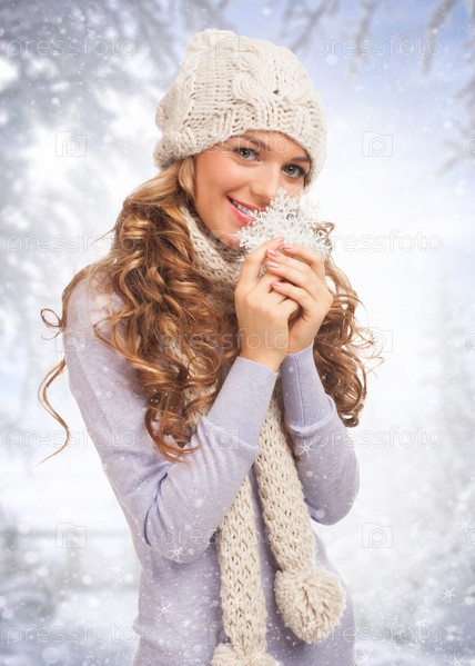 Молодая девушка в шапке, шарфе и варежках со снежинкой в руках на фоне зимнего леса