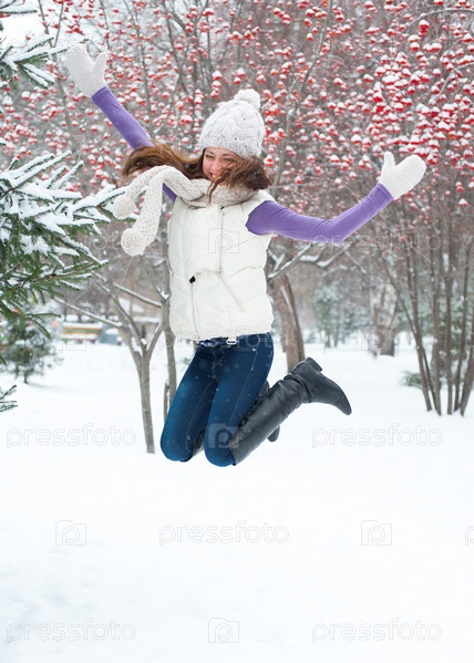 Молодая счастливая девушка в зимней одежде, прыгающая возле заснеженной елки