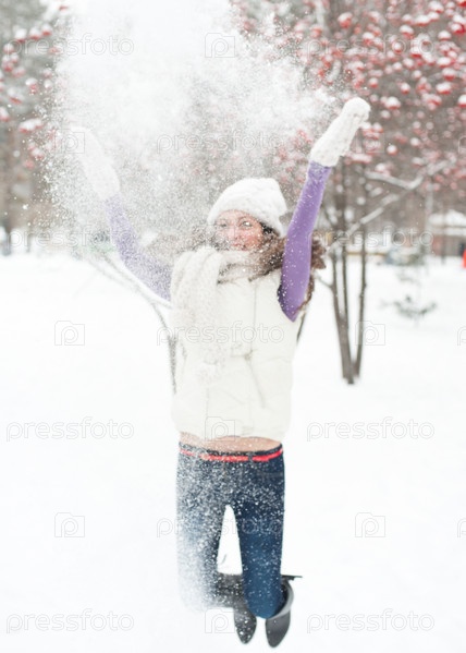 Молодая счастливая девушка в зимней одежде, прыгающая в заснеженном лесу