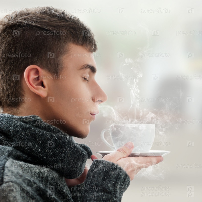 Портрет молодого человека, наслаждающегося горячим напитком в доме
