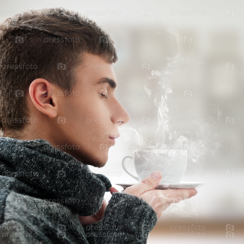 Портрет молодого человека, наслаждающегося горячим напитком в доме