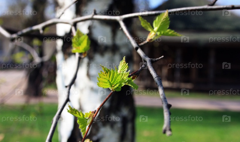 Раскрывшиеся почки с листьями на ветке березы в парке