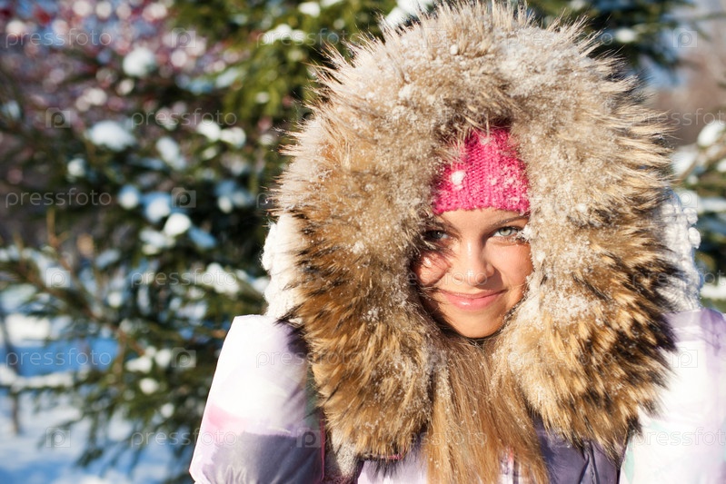 Портрет молодой девушки-подростка в зимней одежде возле елочки