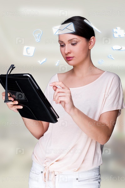 Портрет женщины, работающей на планшетном компьютере