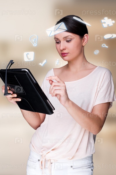 Портрет женщины, работающей на планшетном компьютере
