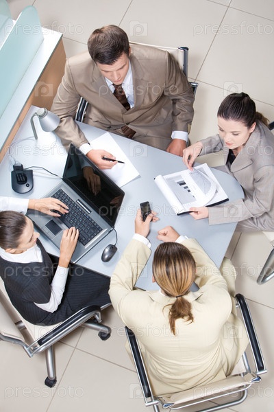 Вид сверху рабочей бизнес-группы, сидящей за столом во время корпоративного совещания