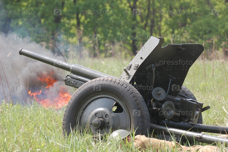 Солдат лежит у пушки 2-й Мировой Войны