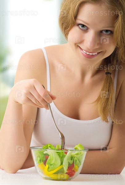 Красивая молодая девушка ест салат