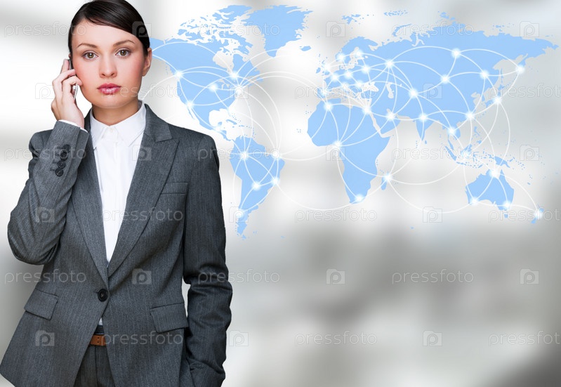 Деловая женщина разговаривает по телефону на фоне карты мира с выделенными маршрутами