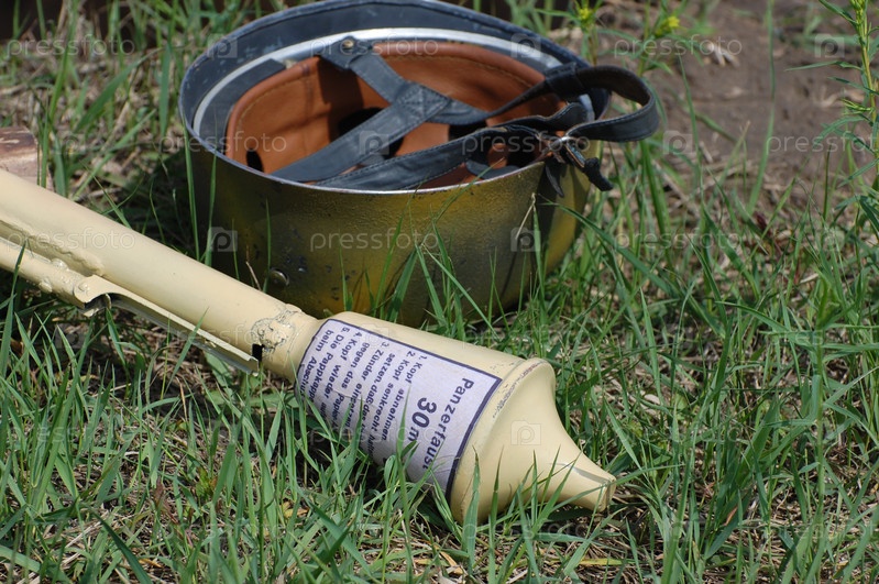 Противотанковый снаряд и каска времен второй Мировой на траве