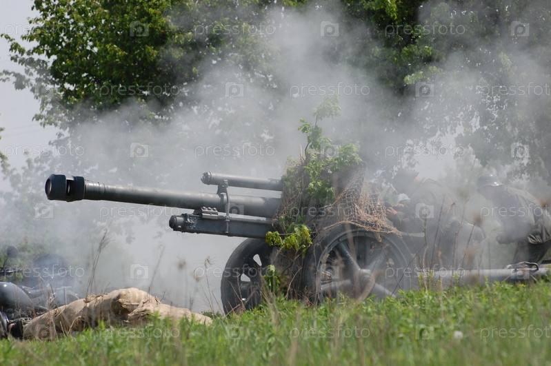 Солдаты ведут огонь из артиллерийской пушки