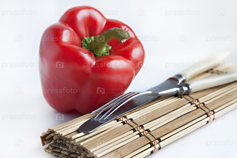 Красный перчик с салфеткой и столовыми приборами
