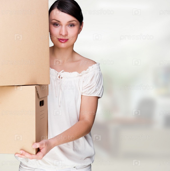Симпатичная девушка с коробками в руках на размытом фоне помещения