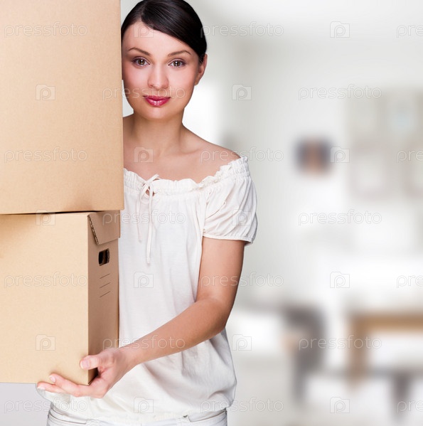 Девушка держит картонные коробки в руках на размытом фоне помещения