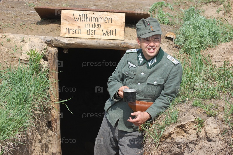 Мужчина в форме немецкого солдата времен второй мировой войны около блиндажа с кружкой чая